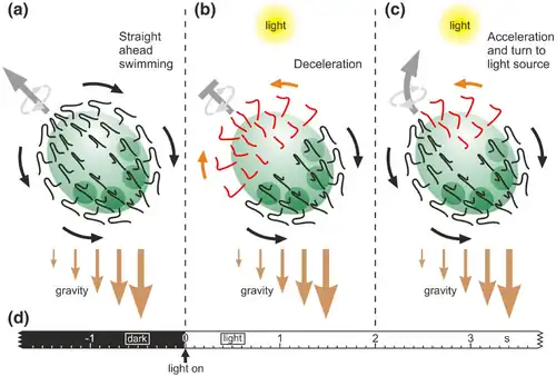 As all other ciliary swimmers, green algae always swim in a spiral. The handedness of the spiral is robust and is guaranteed by the chirality of the cilia. The two cilia of green algae have different beat patterns and functions. In Chlamydomonas, the phototransduction cascade alters the stroke pattern and beating speed of the two cilia differentially in a complex pattern.[53][54] This results in the reorientation of the helical swimming trajectory as long as the helical swimming axis is not aligned with the light vector.[1]