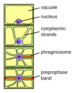 Just before mitosis, a dense band of microtubules appears around the phragmosome and the future division plane just below the plasma membrane. This preprophase band marks the equatorial plane of the future mitotic spindle as well as the future fusion sites for the new cell plate with the existing cell wall.[3] It disappears as soon as the nuclear envelope breaks down and the mitotic spindle forms.