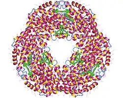 ![]() Allophycocyanin dodekamer + 12 phycocyanobilin (green), Gloeobacter violaceus |