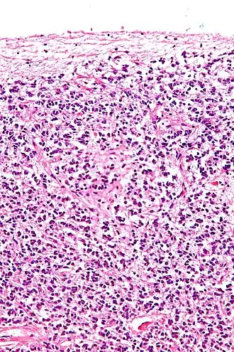 ![]() Cross-section of pineal gland displaying pinealocytes and other cells | |
