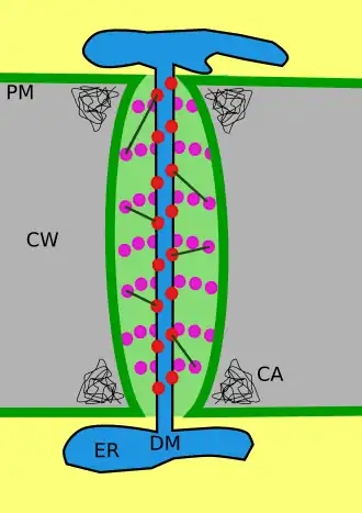 The plasma membrane portion of the plasmodesma is a continuous extension of the cell membrane or plasmalemma and has a similar phospholipid bilayer structure.[13]