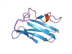 Plastocyanin/azurin family of copper-binding proteins (or blue (type 1) copper domain) is a family of small proteins that bind a single copper atom and that are characterised by an intense electronic absorption band near 600 nm (see copper proteins).[2][3] The most well-known members of this class of proteins are the plant chloroplastic plastocyanins, which exchange electrons with cytochrome c6, and the distantly related bacterial azurins, which exchange electrons with cytochrome c551. This family of proteins also includes amicyanin from bacteria such as Methylobacterium extorquens or Paracoccus versutus (Thiobacillus versutus) that can grow on methylamine; auracyanins A and B from Chloroflexus aurantiacus;[4] blue copper protein from Alcaligenes faecalis; cupredoxin (CPC) from Cucumis sativus (Cucumber) peelings;[5] cusacyanin (basic blue protein; plantacyanin, CBP) from cucumber; halocyanin from Natronomonas pharaonis (Natronobacterium pharaonis),[6] a membrane-associated copper-binding protein; pseudoazurin from Pseudomonas; rusticyanin from Thiobacillus ferrooxidans;[7] stellacyanin from Rhus vernicifera (Japanese lacquer tree); umecyanin from the roots of Armoracia rusticana (Horseradish); and allergen Ra3 from ragweed. This pollen protein has evolutary relation to the above proteins, but seems to have lost the ability to bind copper. Although there is an appreciable amount of divergence in the sequences of all these proteins, the copper ligand sites are conserved.