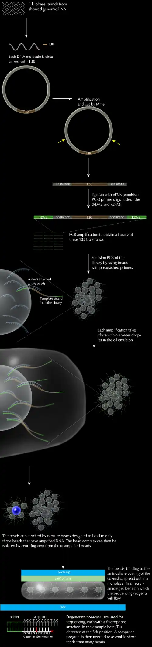 Polony sequencing is a development of the polony technology from the late 1990s and 2000s.[5] Methods were developed in 2003 to sequence in situ polonies using single-base extension which could achieve 5-6 bases reads.[6] By 2005, these early attempts had been overhauled to develop the existing polony sequencing technology.[7] The highly parallel sequencing-by-ligation concepts of polony sequencing has contributed the basis for later sequencing technologies such as ABI Solid Sequencing.