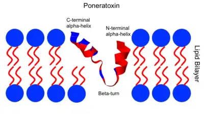 The two alpha helices are formed by residues 3–9 at the N-terminus, and residues 17–24 at the C-terminus, and they are connected by the beta-turn at residues 11–16. From a three-dimensional perspective, this structure forms a preferential V-shape with the two helices undergoing loose non-covalent interactions with each other.[1] This is notable because of its structural similarity to other peptides that interact with the membrane, and indicates that poneratoxin will also interact with the membrane and thereby affect embedded voltage gated sodium channels.[9] Furthermore, the structure of the peptide shifts from a random coil to the structured helix-turn-helix when introduced to a lipid bilayer environment, which indicates that this motif is important for interacting with the membrane.[1]