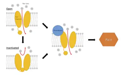 Catterall et al. hypothesized that some polypeptide neurotoxins modify voltage-gated channels function via a "voltage-sensor trapping" mechanism. The hypothesis states that neurotoxins similar to poneratoxin, such as alpha-scorpion toxins, act upon sodium channels via binding to the channels' receptor site 3, which normally affects the channels' ability to inactivate. Therefore, receptor site 3 neurotoxins often affect sodium channels by slowing or blocking inactivation.[2][6] Normally, the region of the channel where neurotoxin receptor site 3 is undergoes a conformational change of an outward movement to lead to inactivation. Receptor site 3 neurotoxins are proposed to prevent this conformational change via interaction with acidic and hydrophobic amino acid residues at that site.[6]