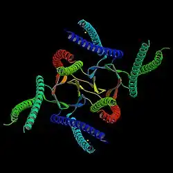 - ↑ Siegert R, Leroux MR, Scheufler C, Hartl FU, Moarefi I (November 2000). "Structure of the molecular chaperone prefoldin: unique interaction of multiple coiled coil tentacles with unfolded proteins". Cell. 103 (4): 621–32. doi:10.1016/s0092-8674(00)00165-3. PMID 11106732.