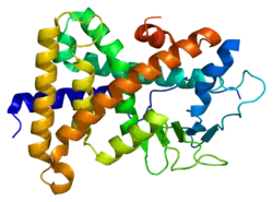 PXR is a nuclear receptor whose primary function is to sense the presence of foreign toxic substances and in response up regulate the expression of proteins involved in the detoxification and clearance of these substances from the body.[8] PXR belongs to the nuclear receptor superfamily, members of which are transcription factors characterized by a ligand-binding domain and a DNA-binding domain. PXR is a transcriptional regulator of the cytochrome P450 gene CYP3A4, binding to the response element of the CYP3A4 promoter as a heterodimer with the 9-cis retinoic acid receptor RXR. It is activated by a range of compounds that induce CYP3A4, including dexamethasone and rifampicin.[7][9]