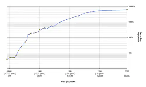 The increasing availability of DNA sequencing since the late 1990s has allowed estimates on Paleolithic effective population sizes.[4][5][6] Such models suggest a human effective population size of the order of 10,000 individuals for the Late Pleistocene. This includes only the breeding population that produced descendants over the long term, and the actual population may have been substantially larger (in the six digits).[7] Sherry et al. (1997) based on Alu elements estimated a roughly constant effective population size of the order of 18,000 individuals for the population of Homo ancestral to modern humans over the past one to two million years.[8] Huff et al. (2010) rejected all models with an ancient effective population size larger than 26,000.[9] For ca. 130,000 years ago, Sjödin et al. (2012) estimate an effective population size of the order of 10,000 to 30,000 individuals, and infer an actual "census population" of early Homo sapiens of roughly 100,000 to 300,000 individuals.[10] The authors also note that their model disfavours the assumption of an early (pre-Out-of-Africa) population bottleneck affecting all of Homo sapiens.[11]
