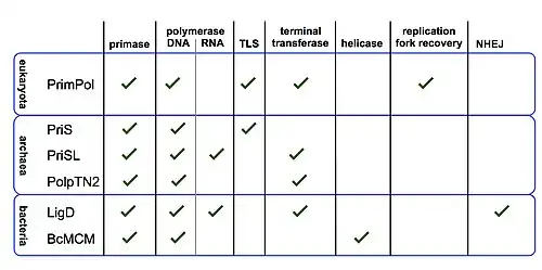 - 1 2 3 4 Guilliam TA, Keen BA, Brissett NC, Doherty AJ (August 2015). "Primase-polymerases are a functionally diverse superfamily of replication and repair enzymes". Nucleic Acids Research. 43 (14): 6651–64. doi:10.1093/nar/gkv625. PMC 4538821. PMID 26109351.