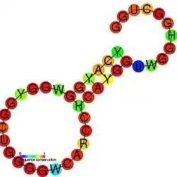 The prion pseudoknot is predicted RNA pseudoknot structure found in prion protein mRNA.[1] It has been suggested that this element has a possible effect in prion protein translation.[2] The human prion protein gene contains 5 copies of a 24 nucleotide repeat that contains this structure.[2] The number of nucleotide repeats found in an organism may vary from one organism to another. Each species has a set number of nucleotide repeats, but when the organism deviates from this number, mutations in the prion genes may arise.[2] Human individuals that exhibit these mutations may be prone to developing prion diseases, such as Creutzfeldt-Jakob disease.[2]