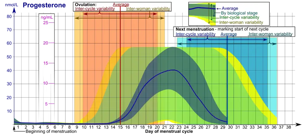 - ↑ Stricker R, Eberhart R, Chevailler MC, Quinn FA, Bischof P, Stricker R (2006). "Establishment of detailed reference values for luteinizing hormone, follicle stimulating hormone, estradiol, and progesterone during different phases of the menstrual cycle on the Abbott ARCHITECT analyzer". Clinical Chemistry and Laboratory Medicine. 44 (7): 883–887. doi:10.1515/CCLM.2006.160. PMID 16776638. S2CID 524952.