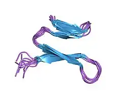 Each individual granulin domain peptide is 60 amino acids in length. Granulin peptides are cysteine rich and capable of forming 6 disulfide bonds per residue.[9] The disulfide bonds form a central rod-like core that shuttles each individual granulin peptide into a stacked β-sheet configuration.[11][8] The structure of the granulin protein is similar to the structure of proteins from protein families that consist of hormones, growth factors, ion channel modulators and enzyme inhibitors.[11] Because of progranulin's structural similarities to these proteins, much research was done to interrogate progranulin's potential role as a growth factor. When progranulin is secreted into the extracellular matrix, it is often glycosylated at four confirmed and one tentative N-linked glycosylation sites.[11][9] The n-terminus of progranulin is hypothesized to be involved in the secretion of progranulin via secretory vesicles.[11] Specifically, progranulin may be involved in regulating exosome excretion.[12] The C-terminus of progranulin is hypothesized to be the primary binding partner of SORT1, a receptor of extracellular progranulin.[13][11] The structural differences between each individual granulin peptide have yet to be characterized.