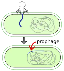 A prophage is a bacteriophage (often shortened to "phage") genome that is integrated into the circular bacterial chromosome or exists as an extrachromosomal plasmid within the bacterial cell.[1] Integration of prophages into the bacterial host is the characteristic step of the lysogenic cycle of temperate phages. Prophages remain latent in the genome through multiple cell divisions until activation by an external factor, such as UV light, leading to production of new phage particles that will lyse the cell and spread. As ubiquitous mobile genetic elements, prophages play important roles in bacterial genetics and evolution, such as in the acquisition of virulence factors.