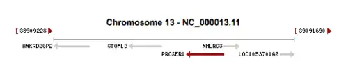 Genes STOML3 and NHLRC3 neighbor PROSER1 on chromosome 13.[7]