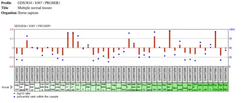 Expressed Sequence Tag mapping of PROSER1 expression shows that it has particularly high expression in lymph, embryonic tissue, thymus, and uterus sites. It has moderate expression in testis, larynx, nerve, blood, and adipose tissue sites.[8] According to the Human Protein Atlas, PROSER1 has general cytoplasmic expression and is expressed in all RNA tissue categories.[9]