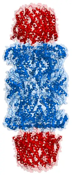 - ↑ Groll M, Ditzel L, Löwe J, Stock D, Bochtler M, Bartunik HD, Huber R (April 1997). "Structure of 20S proteasome from yeast at 2.4 A resolution". Nature. 386 (6624): 463–71. Bibcode:1997Natur.386..463G. doi:10.1038/386463a0. PMID 9087403. S2CID 4261663.