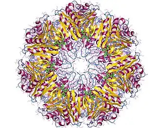 This 20-S protein is composed of 28 subunits arranged in four rings of seven.