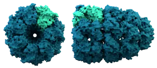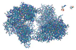 A typical bacterial cell, e.g. E. coli and Staphylococcus aureus, is estimated to contain about 2 million proteins. Smaller bacteria, such as Mycoplasma or spirochetes contain fewer molecules, on the order of 50,000 to 1 million. By contrast, eukaryotic cells are larger and thus contain much more protein. For instance, yeast cells have been estimated to contain about 50 million proteins and human cells on the order of 1 to 3 billion.[43] The concentration of individual protein copies ranges from a few molecules per cell up to 20 million.[44] Not all genes coding proteins are expressed in most cells and their number depends on, for example, cell type and external stimuli. For instance, of the 20,000 or so proteins encoded by the human genome, only 6,000 are detected in lymphoblastoid cells.[45] The most abundant protein in nature is thought to be RuBisCO, an enzyme that catalyzes the incorporation of carbon dioxide into organic matter in photosynthesis. Plants can consist of as much as 1% by weight of this enzyme,[46]