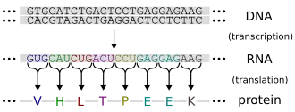Proteins are assembled from amino acids using information encoded in genes. Each protein has its own unique amino acid sequence that is specified by the nucleotide sequence of the gene encoding this protein. The genetic code is a set of three-nucleotide sets called codons and each three-nucleotide combination designates an amino acid, for example AUG (adenine–uracil–guanine) is the code for methionine. Because DNA contains four nucleotides, the total number of possible codons is 64; hence, there is some redundancy in the genetic code, with some amino acids specified by more than one codon.[42]: 1002–42 Genes encoded in DNA are first transcribed into pre-messenger RNA (mRNA) by proteins such as RNA polymerase. Most organisms then process the pre-mRNA (a primary transcript) using various forms of post-transcriptional modification to form the mature mRNA, which is then used as a template for protein synthesis by the ribosome. In prokaryotes the mRNA may either be used as soon as it is produced, or be bound by a ribosome after having moved away from the nucleoid. In contrast, eukaryotes make mRNA in the cell nucleus and then translocate it across the nuclear membrane into the cytoplasm, where protein synthesis then takes place. The rate of protein synthesis is higher in prokaryotes than eukaryotes and can reach up to 20 amino acids per second.[47]
