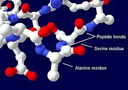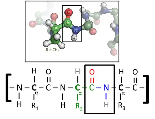 The amino acids in a polypeptide chain are linked by peptide bonds between amino and carboxyl group. An individual amino acid in a chain is called a residue, and the linked series of carbon, nitrogen, and oxygen atoms are known as the main chain or protein backbone.[36]: 19 The peptide bond has two resonance forms that confer some double-bond character to the backbone. The alpha carbons are roughly coplanar with the nitrogen and the carbonyl (C=O) group. The other two dihedral angles in the peptide bond determine the local shape assumed by the protein backbone. One conseqence of the N-C(O) double bond character is that proteins are somewhat rigid.[36]: 31 A polypeptide chain ends with a free amino group, known as the N-terminus or amino terminus, and a free carboxyl group, known as the C-terminus or carboxy terminus.[37] By convention, peptide sequences are written N-terminus to C-terminus, correlating with the order in which proteins are synthesized by ribosomes.[37][38]