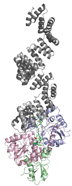 The human OGT gene has 1046 amino acid residues, and is a heterotrimer consisting of two 110 kDa subunits and one 78 kDa subunit.[10] The 110 kDa subunit contains 13 tetratricopeptide repeats (TPRs); the 13th repeat is truncated. These subunits are dimerized by TPR repeats 6 and 7. OGT is highly expressed in the pancreas and also expressed in the heart, brain, skeletal muscle, and the placenta. There have been trace amounts found in the lung and the liver.[5] The binding sites have been determined for the 110 kDa subunit. It has 3 binding sites at amino acid residues 849, 852, and 935. The probable active site is at residue 508.[16]