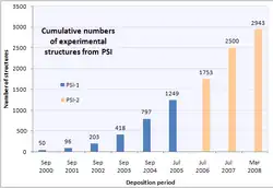 The project has been organized into three separate phases. The first phase of the Protein Structure Initiative (PSI-1) spanned from 2000 to 2005, and was dedicated to demonstrating the feasibility of high-throughput structure determination, solving unique protein structures, and preparing for a subsequent production phase.[2] The second phase, PSI-2, focused on implementing the high-throughput structure determination methods developed in PSI-1, as well as homology modeling and addressing bottlenecks like modeling membrane proteins.[3] The third phase, PSI:Biology, began in 2010 and consisted of networks of investigators applying high-throughput structure determination to study a broad range of biological and biomedical problems.[4] PSI program ended on 7/1/2015,[5] even that some of the PSI centers continue structure determination supported by other funding mechanisms.