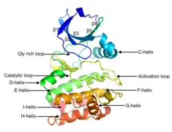 The protein kinase domain is a structurally conserved protein domain containing the catalytic function of protein kinases.[2][3][4] Protein kinases are a group of enzymes that move a phosphate group onto proteins, in a process called phosphorylation. This functions as an on/off switch for many cellular processes, including metabolism, transcription, cell cycle progression, cytoskeletal rearrangement and cell movement, apoptosis, and differentiation. They also function in embryonic development, physiological responses, and in the nervous and immune system. Abnormal phosphorylation causes many human diseases, including cancer, and drugs that affect phosphorylation can treat those diseases.[5]