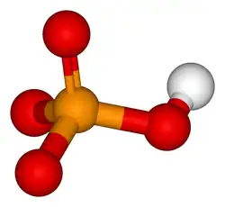 Above is a ball-and-stick model of the inorganic phosphate molecule (HPO42−). Colour coding: P (orange); O (red); H (white).