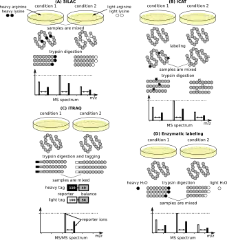 Typically, stable (e.g. non-radioactive) heavier isotopes of carbon (13C) or nitrogen (15N) are incorporated into one sample while the other one is labeled with corresponding light isotopes (e.g. 12C and 14N).[25] The two samples are mixed before the analysis. Peptides derived from the different samples can be distinguished due to their mass difference. The ratio of their peak intensities corresponds to the relative abundance ratio of the peptides (and proteins). The first generation of methods for isotope labeling included SILAC (stable isotope labeling by amino acids in cell culture), trypsin-catalyzed 18O labeling, ICAT (isotope coded affinity tagging), and iTRAQ (isobaric tags for relative and absolute quantitation).[26] The more recent generation of multiplexing methods include tandem mass tags (TMT) for DDA data and mTRAQ for multiplexed DIA (plexDIA).[27]