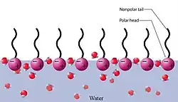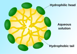 When phospholipids or simple lipids like fatty acids are placed in water, the molecules spontaneously arrange such that the hydrophobic tails are shielded from the water, resulting in the formation of membrane structures such as bilayers, vesicles, and micelles.[27] In modern cells, vesicles are involved in metabolism, transport, buoyancy control,[28] and enzyme storage. They can also act as natural chemical reaction chambers. A typical vesicle or micelle in aqueous solution forms an aggregate with the hydrophilic "head" regions in contact with surrounding solvent, sequestering the hydrophobic single-tail regions in the micelle center. This phase is caused by the packing behavior of single-tail lipids in a bilayer. Although the spontaneous self-assembly process that form lipid monolayer vesicles and micelles in nature resemble the kinds of primordial vesicles or protocells that might have existed at the beginning of evolution, they are not as sophisticated as the bilayer membranes of today's living organisms.[29] However, in a prebiotic context, electrostatic interactions induced by short, positively charged, hydrophobic peptides containing seven amino acids in length or fewer, can attach RNA to a vesicle membrane, the basic cell membrane.[30][31]