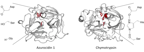 Comparison of Azurocidin 1 structure (pseudoprotease) to Chymotrypsin (functional protease) of same superfamily