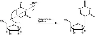 Pseudouridine is the most abundant RNA modification in cellular RNA[2] and one of over 100 chemically distinct modifications that may affect translation or other functions of RNA. Pseudouridine is the C5-glycoside isomer of uridine that contains a C-C bond between C1 of the ribose sugar and C5 of uracil, rather than usual C1-N1 bond found in uridine. Uridine is converted to pseudouridine by rotating the uridine molecule 180° across its N3-C6 axis.[3] The C-C bond gives it more rotational freedom and conformational flexibility.[4] In addition, pseudouridine has an extra hydrogen bond donor at the N1 position.