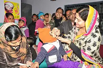 The pulse vaccination strategy is a method used to eradicate an epidemic by repeatedly vaccinating a group at risk, over a defined age range, until the spread of the pathogen has been stopped. It is most commonly used during measles and polio epidemics to quickly stop the spread and contain the outbreak.[1][2]