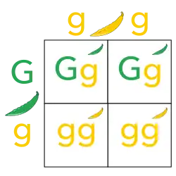 A Punnett square showing a typical test cross. (Green pod color is dominant over yellow for pea pods[1] in contrast to pea seeds, where yellow cotyledon color is dominant over green[2]).