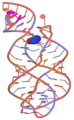 - ↑ Schwalbe, H; Wacker A; Buck J; Richter C; Wohnert J (2011). "Structure and dynamics of the deoxyguanosine-sensing riboswitch studied by NMR-spectroscopy". Nucleic Acids Research. 39 (15): 6802–6812. doi:10.1093/nar/gkr238. PMC 3159443. PMID 21576236.