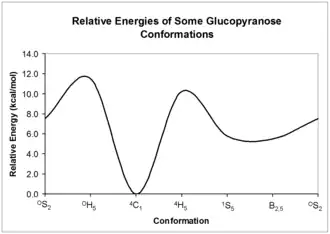 - ↑ Biarns, X.; Ardvol, A.; Planas, A.; Rovira, C.; Laio, A.; Parrinello, M. (2007). "The Conformational Free Energy Landscape of β-D-Glucopyranose. Implications for Substrate Preactivation in β-Glucoside Hydrolases". Journal of the American Chemical Society. 129 (35): 10686–10693. doi:10.1021/ja068411o. PMID 17696342.