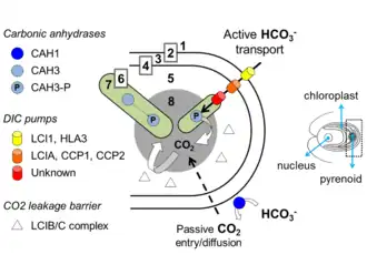 - ↑ Moroney, J. V., & Ynalvez, R. A. (2007). Proposed carbon dioxide concentrating mechanism in Chlamydomonas reinhardtii. Eukaryotic cell, 6(8), 1251-1259. PMID 17557885