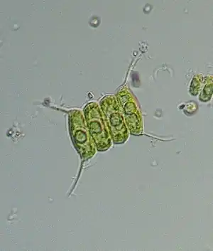 Pyrenoids are found in algal lineages,[1] irrespective of whether the chloroplast was inherited from a single endosymbiotic event (e.g. green and red algae, but not in glaucophytes) or multiple endosymbiotic events (diatoms, dinoflagellates, coccolithophores, cryptophytes, chlorarachniophytes, and euglenozoa). Some algal groups, however, lack pyrenoids altogether: "higher" red algae and extremophile red algae, the green alga genera Chloromonas and Mougeotiopsis,[46] and "golden algae". Pyrenoids are usually considered to be poor taxonomic markers and may have evolved independently many times.[47]