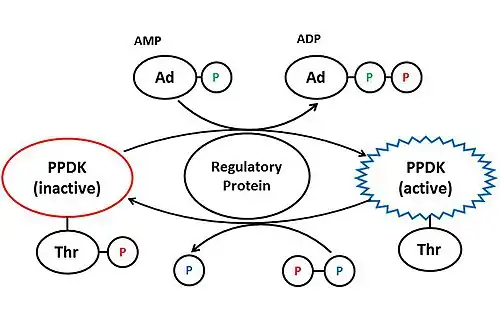 Plant PPDK is regulated by the pyruvate, phosphate dikinase regulatory protein (PDRP).[4] When levels of light are high, PDRP dephosphorylates Thr456 on PPDK using AMP, thus activating the enzyme.[10] PDRP deactivates PPDK by phosphorylating the same threonine residue, using diphosphate. PDRP is a unique regulator because it catalyses both activation and deactivation of PPDK, through two different mechanisms.[10]
