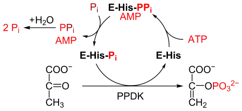 The reaction is similar to the reaction catalysed by pyruvate kinase, which also converts pyruvate to PEP.[3] However, pyruvate kinase catalyses an irreversible reaction, and does not consume ATP. By contrast, PPDK catalyses a reversible reaction, and consumes 1 molecule of ATP for each molecule of pyruvate converted.