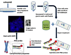 Another adaptation that utilizes PNAs and FISH is known as CO-FISH (Chromosome Orientation-FISH) which allows for the labelling of chromosomes with PNAs in a strand specific manner. This method involves the selective removal of newly replicated strands of DNA (through the use of BrdU incorporation), resulting in only single stranded target DNA. By using different colored unidirectional PNA probes, it becomes possible to uniquely label sister chromatids.[12][13]