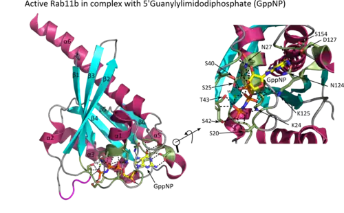 All Ras GTPases consist of a similar core structure and highly conserved P-loop, switch 1 and switch 2 regions. The Rab11b monomer exhibits a typical Ras-like, small GTPase fold with a six stranded β-sheet core (β1-β6) surrounded by five major α-helices (α1-α5)[16] and one minor α-helix (α6). According to the sequence similarity to other Rab GTPases can be assumed that they show closely resembling characteristics in nucleotide binding and hydrolysis. However, Rab11 isoforms could differ in hydrolysis kinetics owing to the differences in conformation, since Rab11a and Rab11b do not show an α-helical switch 2 region like other Rab GTPases. Rab11b shares 90% amino acid identity to Rab11a.[16] Kinetic experiments with Rab11a/b and Rab11-interacting proteins (FIPs) indicate that FIPs cannot differentiate between GTP-bound Rab11a and Rab11b in vitro.[20] The major divergence reveals in the inactive state. While Pasqualato et al. crystallized inactive Rab11a as a dimer in the asymmetric unit, Scapin et al. observed single crystallographically independent monomers of both the GDP- and the GppNHp-bound Rab11b structures.[16][21]