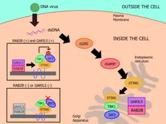 Studies have also shown that RAB2B affects the IFN antiviral response which is induced by cytosolic DNA. Because of this, RAB2B deficiency allows for vaccinia virus to replicate itself. After DNA stimulation, RAB2B attaches itself on the Golgi apparatus, along with stimulator of interferon genes (STING), the downstream signal mediator of cGAS. In order for RAB2B to adhere to the Golgi apparatus, RAB2B’s GTP-binding activity is required, as well as for the recruitment of GARIL5, so the RAB2B-GARIL5 complex can be formed. It is also shown that GARIL5 deficiency affects the IFN antiviral response, indicating that the entire RAB2B-GARIL5 complex regulates the cGAS-STING signalling axis, thus promoting IFN responses against cytosolic DNA (DNA viruses).[10]