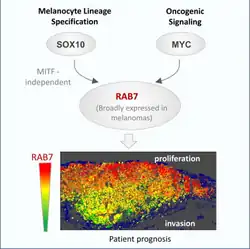 Melanoma cells retain a developmental memory that reflects a unique wiring of vesicles trafficking pathways. Rab7 is seen to control the proliferative and invasive potential of these aggressive tumors upon identification of melanoma enriched endolysosomal gene cluster. Lysosomal-associated degradation, a universal feature of eukaryotic cells, can be hijacked in a tumor-type- and stage –dependent manner. Finding that RAB7 is controlled by SOX10 and MYC in a MITF-independent manner has important basic and translational implications.[23] Sox10 is not inhibited by mechanisms that downregulate MITF, some of which including BRAF mutations, are relatively frequent in malignant melanomas. This may ensure a developmental memory in the expression of RAB7. It is speculated that downregulation of RAB7 in the invasive front of aggressive melanomas is modulated by epithelial-to-mesenchymal-like mechanisms, such as those recently described to underlie the transcriptional switch associated with prometastatic phenotypes. In otherwords, there is an inherent dependency of melanoma cells on the small GTPase RAB7, identified within a lysosomal gene cluster that distinguishes this malignancy from over 35 tumor types. Analyses in human cells, clinical specimens, and mouse models demonstrated that RAB7 is an early-induced melanoma driver whose levels can be tuned to favor tumor invasion, ultimately defining metastatic risk. Importantly, RAB7 levels and function were independent of MITF and instead, the neuroectodermal master modulator SOX10 and the oncogene MYC are key RAB7a regulators.[23]