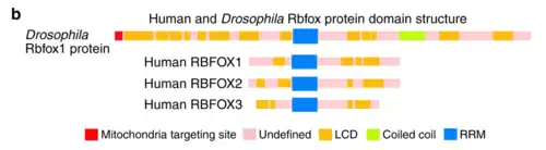 - ↑ Sun S, Zhang Z, Fregoso O, Krainer AR (2012-02-01). "Mechanisms of activation and repression by the alternative splicing factors RBFOX1/2". RNA. 18 (2): 274–283. doi:10.1261/rna.030486.111. ISSN 1355-8382. PMC 3264914. PMID 22184459.