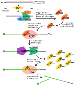 The primary Argonaute complex recruits an RNA-dependent RNA polymerase (RdRP) to generate secondary siRNAs, triggering an amplification response. Secondary siRNAs are bound by degenerate secondary Argonautes, which are then directly involved in target transcript degradation.[6] However, RDE-1 shows no stable association with the more abundant secondary siRNAs.[7]