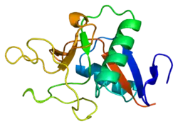 Pancreatic Stone Protein (PSP), also known as Lithostathine-1-alpha islet cells regeneration factor (ICRF) or islet of Langerhans regenerating protein (REG) is a protein that in humans is encoded by the REG1A gene as a single polypeptide of 144 amino acids further cleaved by trypsin to produce a 133 amino acid protein that is O-linked glycosylated on threonine 27. This protein is a type I subclass member of the Regenerating protein family. The Reg protein family is a multi protein family grouped into four subclasses, types I, II, III and IV based on the primary structures of the proteins.[4][5][6] Reg family members REG1B, REGL, PAP and this gene are tandemly clustered on chromosome 2p12 and may have arisen from the same ancestral gene by gene duplication.[6] The PSP is mostly produced in Human by the acinar cells of the pancreas and is secreted in the duodenum by the same pathway that pancreatic exocrine enzymes. It has C-terminal C-type lectin domain whose binding partner is currently unknown.