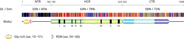 Structurally, RHAU is a 1008 amino acid-long modular protein. It consists of a ~440-amino acid helicase core comprising all signature motifs of the DEAH-box family of helicases with N- and C-terminal flanking regions of ~180 and ~380 amino acids, respectively. Like all the DEAH-box proteins, the helicase associated domain is located adjacent to the helicase core region and occupies 75% of the C-terminal region.