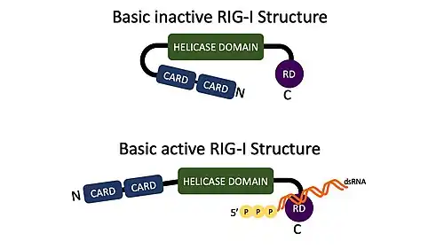 RIG-I is encoded by the DDX58 gene in humans.[9][15] RIG-I is a helical ATP-dependent DExD/H box RNA helicase with a repressor domain (RD) on the C-terminus that binds to the target RNA.[5][9] Included on the N-terminus are two caspase activation and recruitment domains (CARDs) that are important for interactions with mitochondrial antiviral signaling protein (MAVS).[5][9] RIG-I is a member of the RIG-I like receptors (RLRs) that also includes Melanoma Differentiation-Associated protein 5 (MDA5) and Laboratory of genetics physiology 2 (LGP2).[5][9] RIG-I and MDA5 are both involved in activating MAVS and triggering an antiviral response.[16]