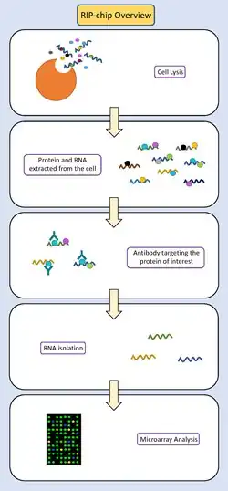 RIP-chip (RNA immunoprecipitation chip) is a molecular biology technique which combines RNA immunoprecipitation with a microarray. The purpose of this technique is to identify which RNA sequences interact with a particular RNA binding protein of interest in vivo.[1][2][3][4] It can also be used to determine relative levels of gene expression, to identify subsets of RNAs which may be co-regulated, or to identify RNAs that may have related functions.[4][5] This technique provides insight into the post-transcriptional gene regulation which occurs between RNA and RNA binding proteins.[5]
